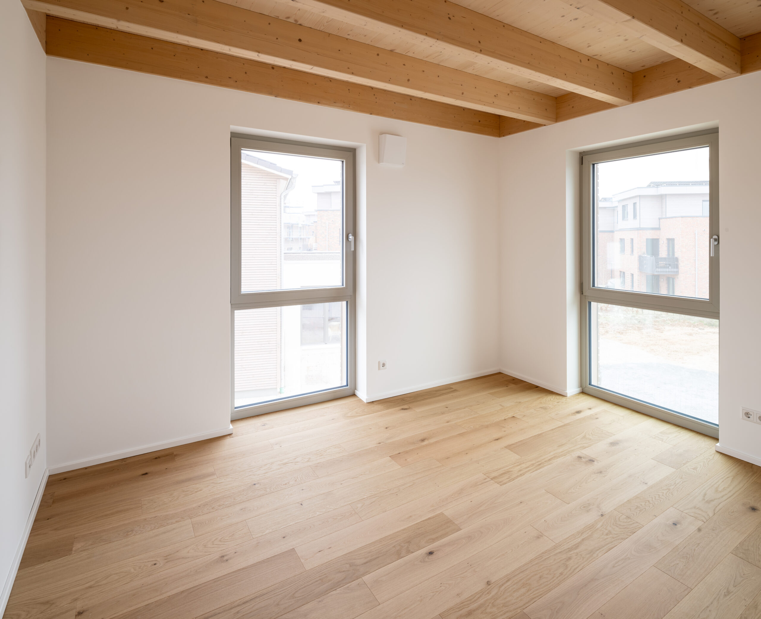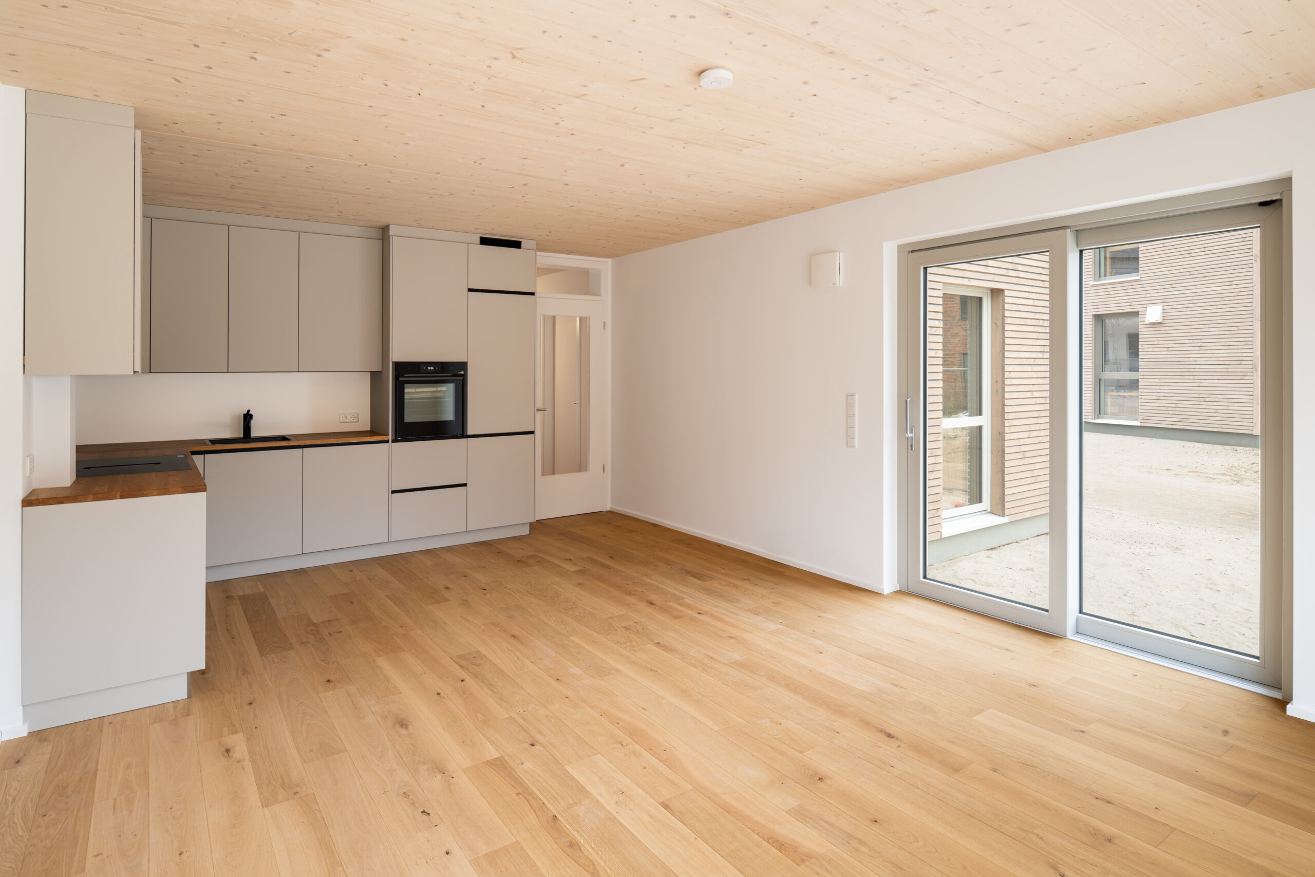 Die Einzelhäuser sind in vorgefertigter Holzbauweise, ohne Kellergeschoss auf einer
